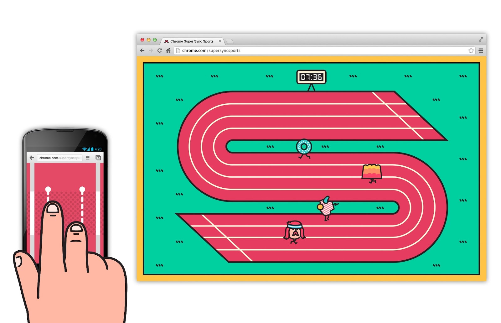 Les smartphones et les tablettes sont d’excellentes plateformes de jeux, et nous avons souhaité développer de nouvelles façons de jouer. Chrome Super Sync Sports est une nouvelle Chrome Experiment qui utilise les fonctionnalités des appareils mobiles pour créer une expérience de jeu innovante, disponible sur petits et grands écrans. Jusqu’à quatre joueurs peuvent se défier et faire la course, pédaler, ou nager, en utilisant leur smartphone ou leur tablette comme une manette de jeu.